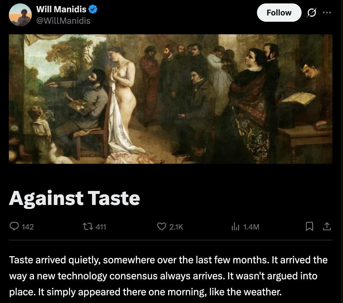 Word choice is important. They carry the weight of historical use, and this is the basis of Mandis’s viral counterargument. “Taste” is young. Art is much, much older. For most of its history, art has been a partnership between labor and patron, and usually aimed at representing something greater than themselves: a god, an ideal, a worldview. The laborers who understood the craft and the patrons funding it didn’t always agree, and this friction, aimed at something transcendent, is what led to great art in the past. Things shifted in modern times. The patron, who was a part of the creative process, was replaced by the collector, who was not, and art became assets - signifiers of wealth and prestige. Artists still strived to depict complex ideas, and continue to do so today, but their names became brands to display with carefully calibrated ostentation. “Taste” was born - and it permeated through art and into fashion, interior design, and so on. It’s less about which art “is” good, and more about which art “makes its owner look good”. We carried that idea of taste as an act of self presentation forward to today. Now, the collector doesn’t need to interact with an artist. They only need to submit a prompt.