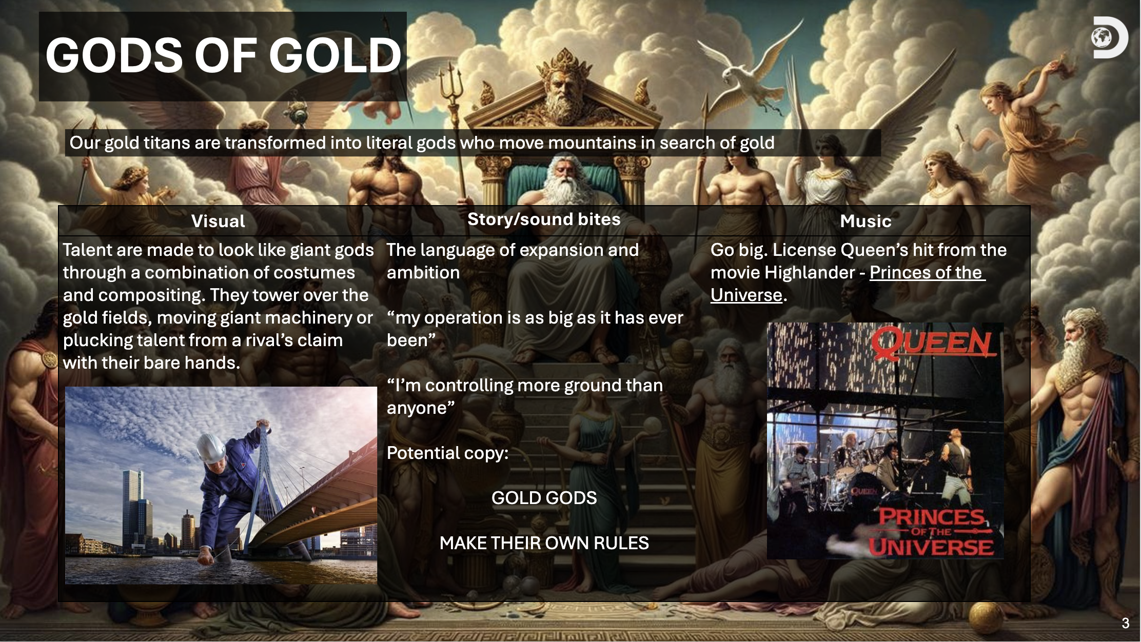 I jotted down “Gods of Gold” and thought about what that would look like; what kind of copy and music would work with that, etc.
